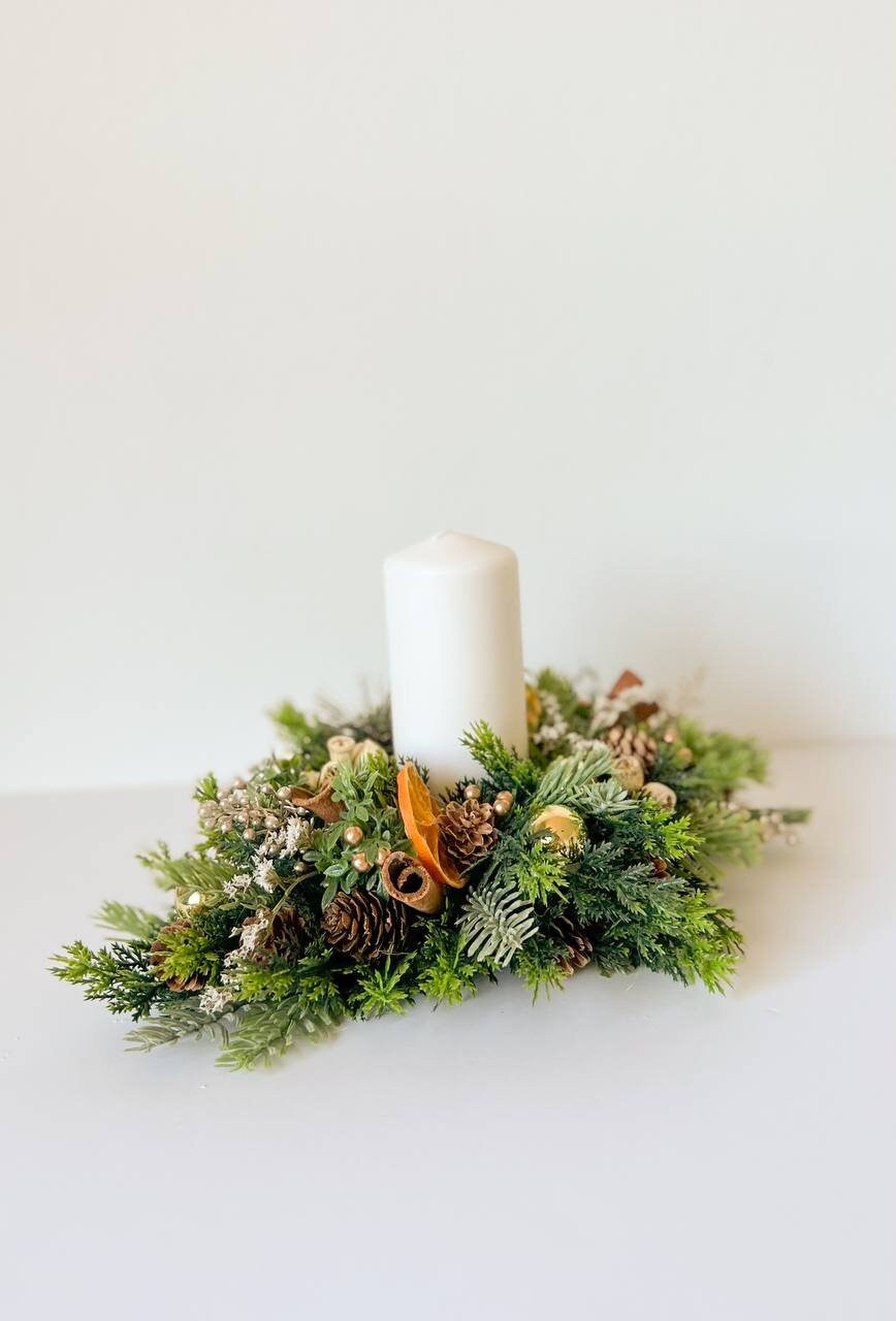 Farmhouse Christmas Arrangement, Winter Centerpiece with Candle, Christmas Table Decor w candle, Christmas Greenery Arrangement with Berries
