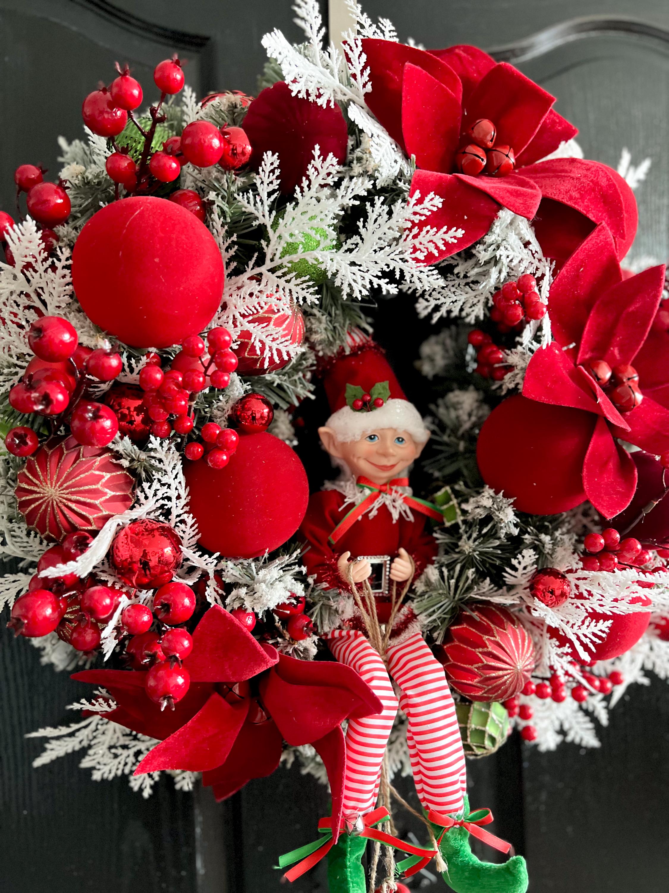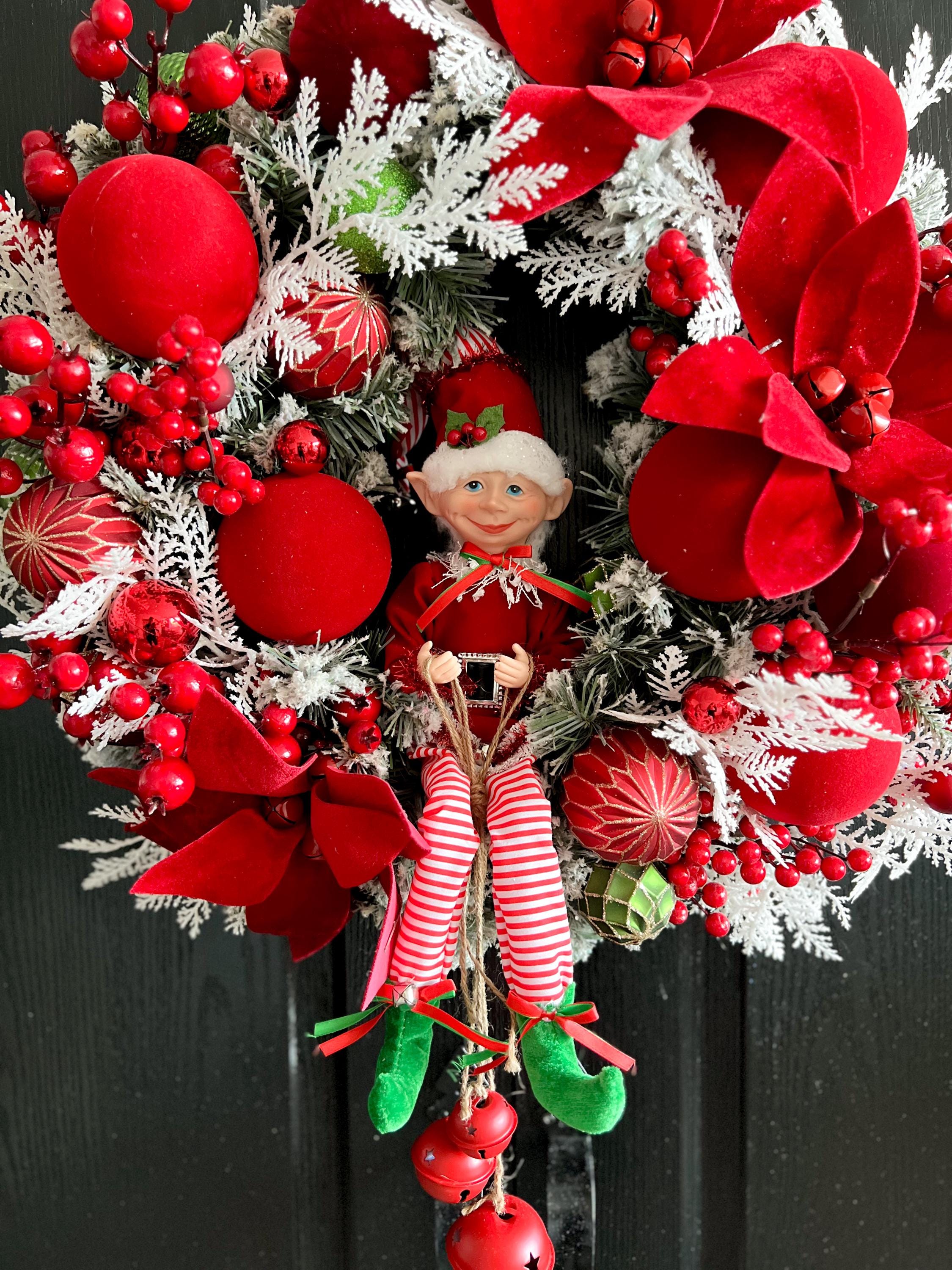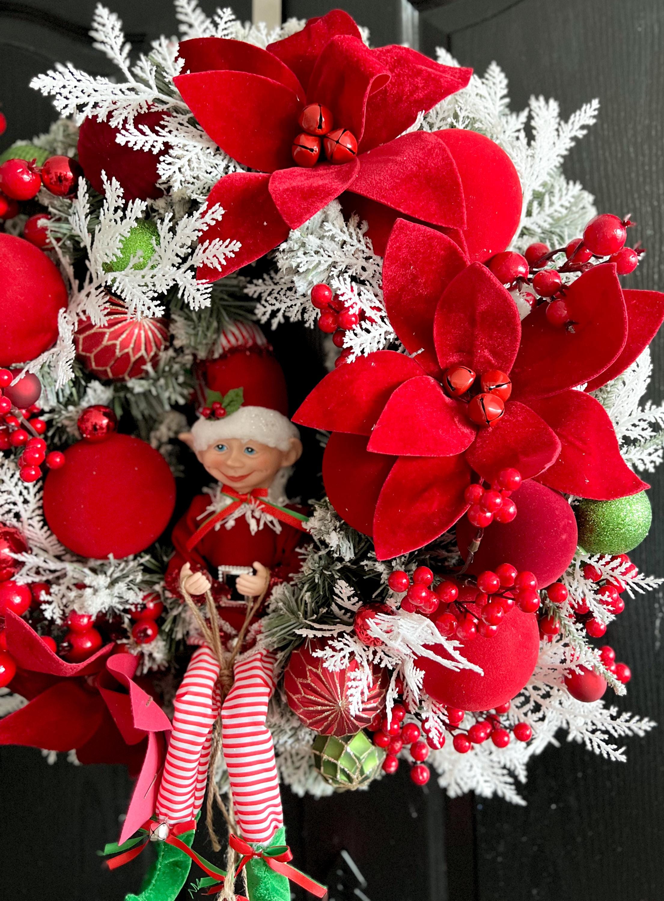 Handcrafted Christmas Wreath featuring a whimsical elf centerpiece, vibrant red poinsettias, frosted greenery, and festive red ornaments. This wreath is accented with elf and jingling bells for a playful touch. Perfect for bringing holiday cheer to your front door or as a seasonal decor piece indoors.