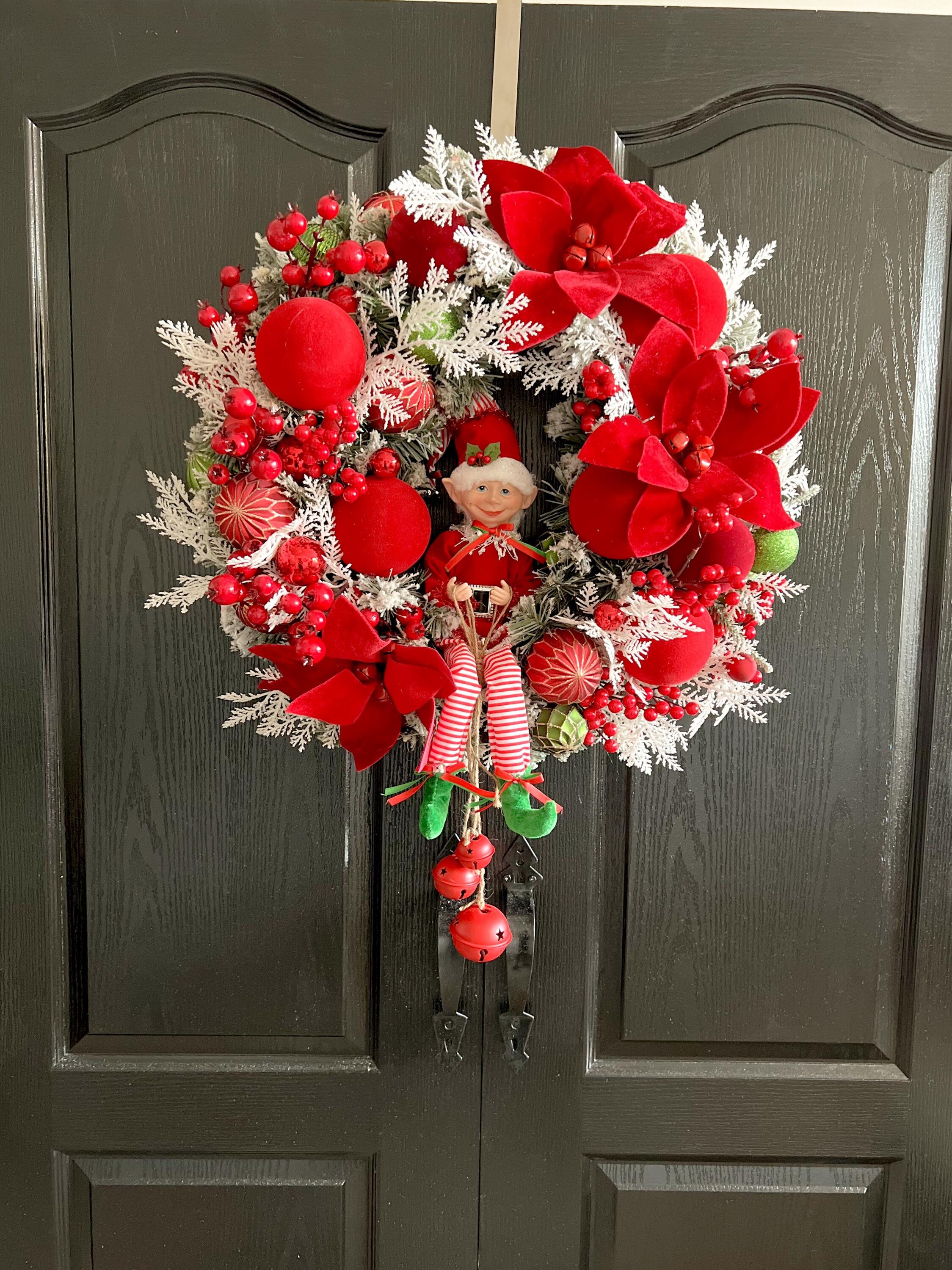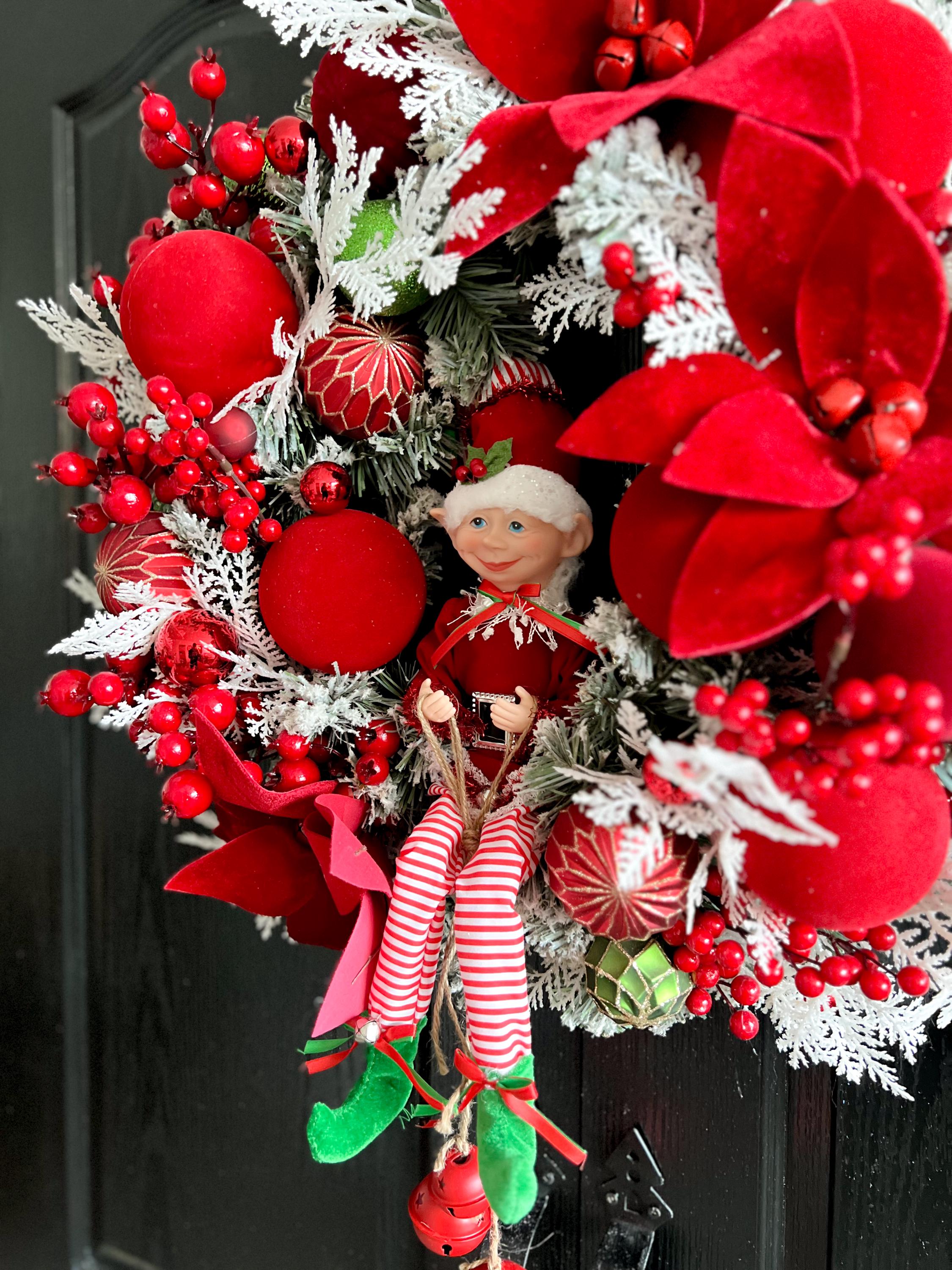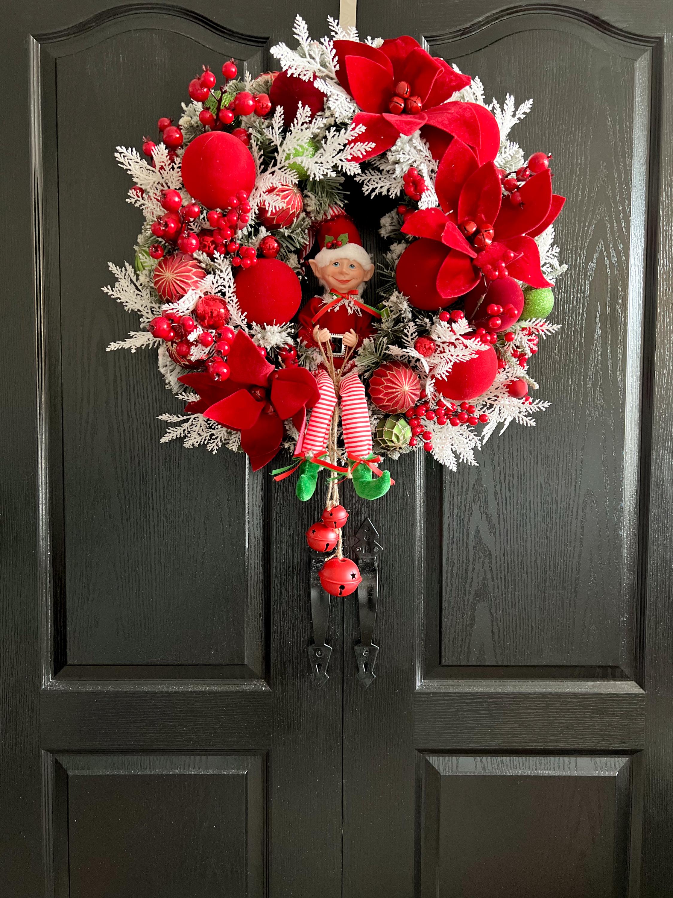 Handcrafted Christmas Wreath featuring a whimsical elf centerpiece, vibrant red poinsettias, frosted greenery, and festive red ornaments. This wreath is accented with elf and jingling bells for a playful touch. Perfect for bringing holiday cheer to your front door or as a seasonal decor piece indoors.
